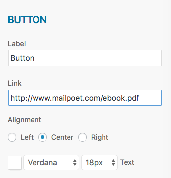 Here, you simply need to add a link to the PDF file to an image, button, or text inside your newsletter. In the example below, we added a button with a link to our ebook.pdf file: