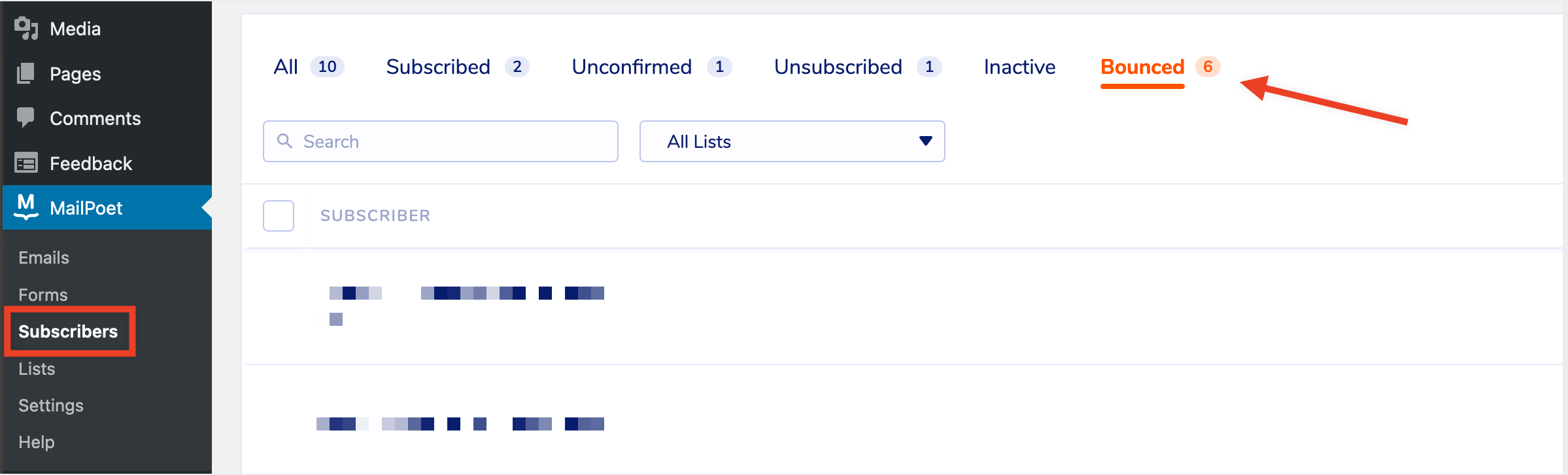 Then you’ll have to search for the bounced emails in the MailPoet > Subscribers page and manually edit their status to mark them as “Bounced” or “Unsubscribed”.