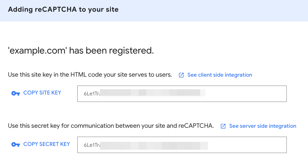 After registering a new site, you’ll see your Site Key and your Secret Key:
