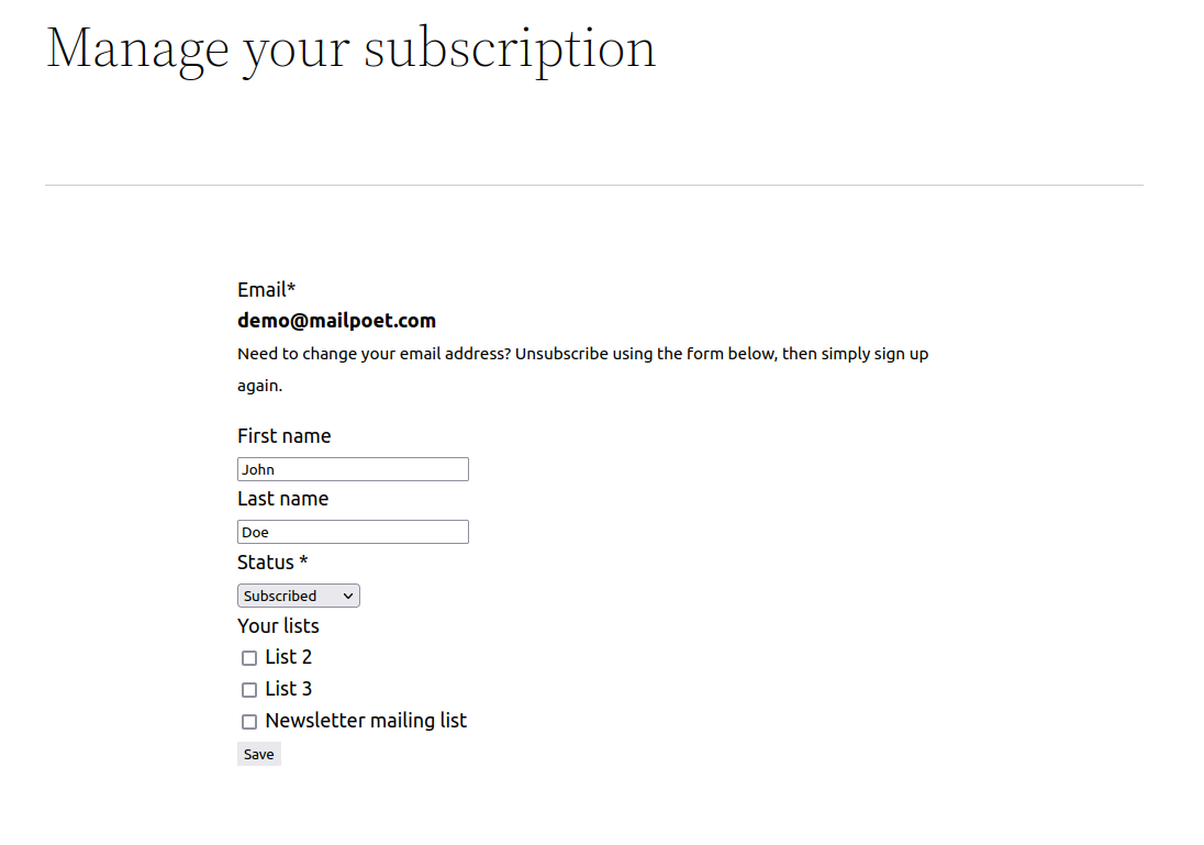 MailPoet provides a default page for subscribers to manage their subscription. When they access the Manage Your Subscription link in a Newsletter, they go to a page like this: