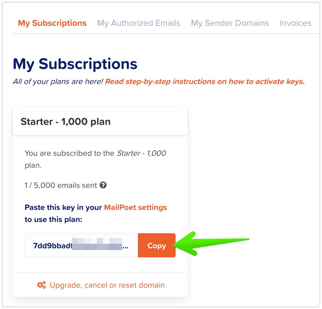 After subscribing to a MailPoet plan, you will receive your activation key via email. You can also grab it from your MailPoet account page at https://account.mailpoet.com/account. On the “My Subscriptions” page, you’ll see the key for your plan and you can copy it by clicking the “Copy” button: