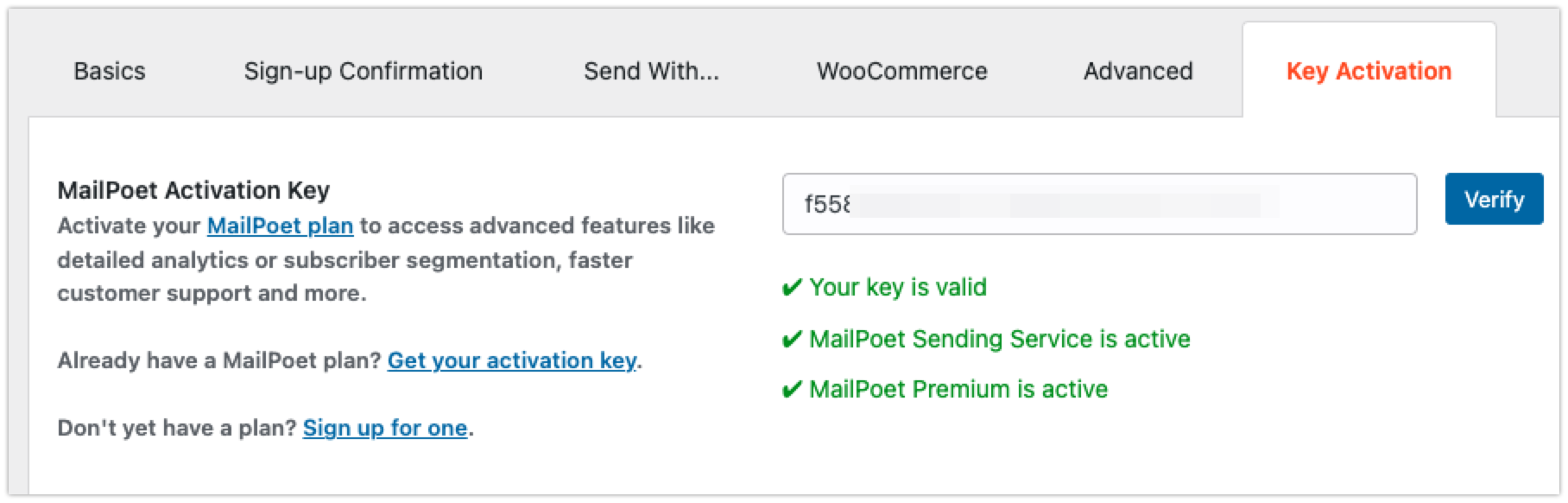 Go to your WordPress dashboard > MailPoet > Settings > Key Activation tab, paste the key in the field, and then click “Verify”:
