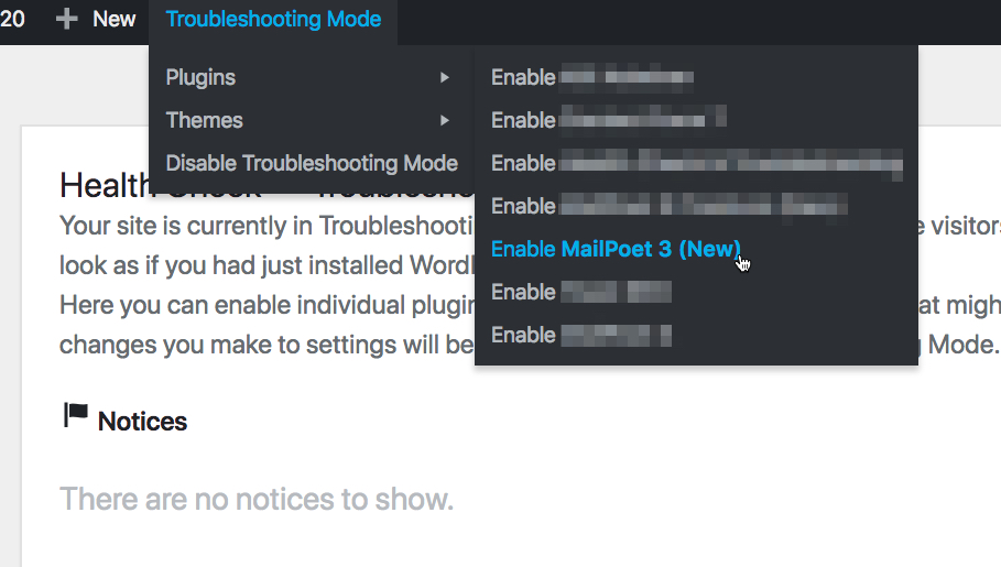 4. Enable MailPoet plugin in the Troubleshooting Mode first and try MailPoet to see if it works normally with all the other plugins disabled.
