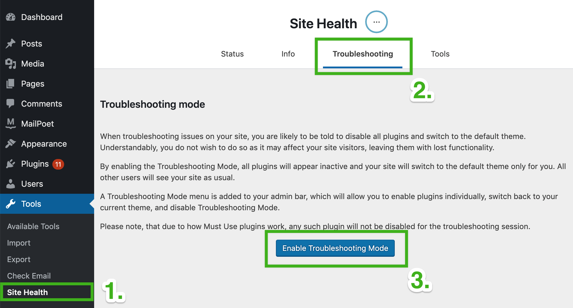 1. In your WordPress admin, go to Tools > Site Health > Troubleshooting and click on “Enable Troubleshooting Mode” :