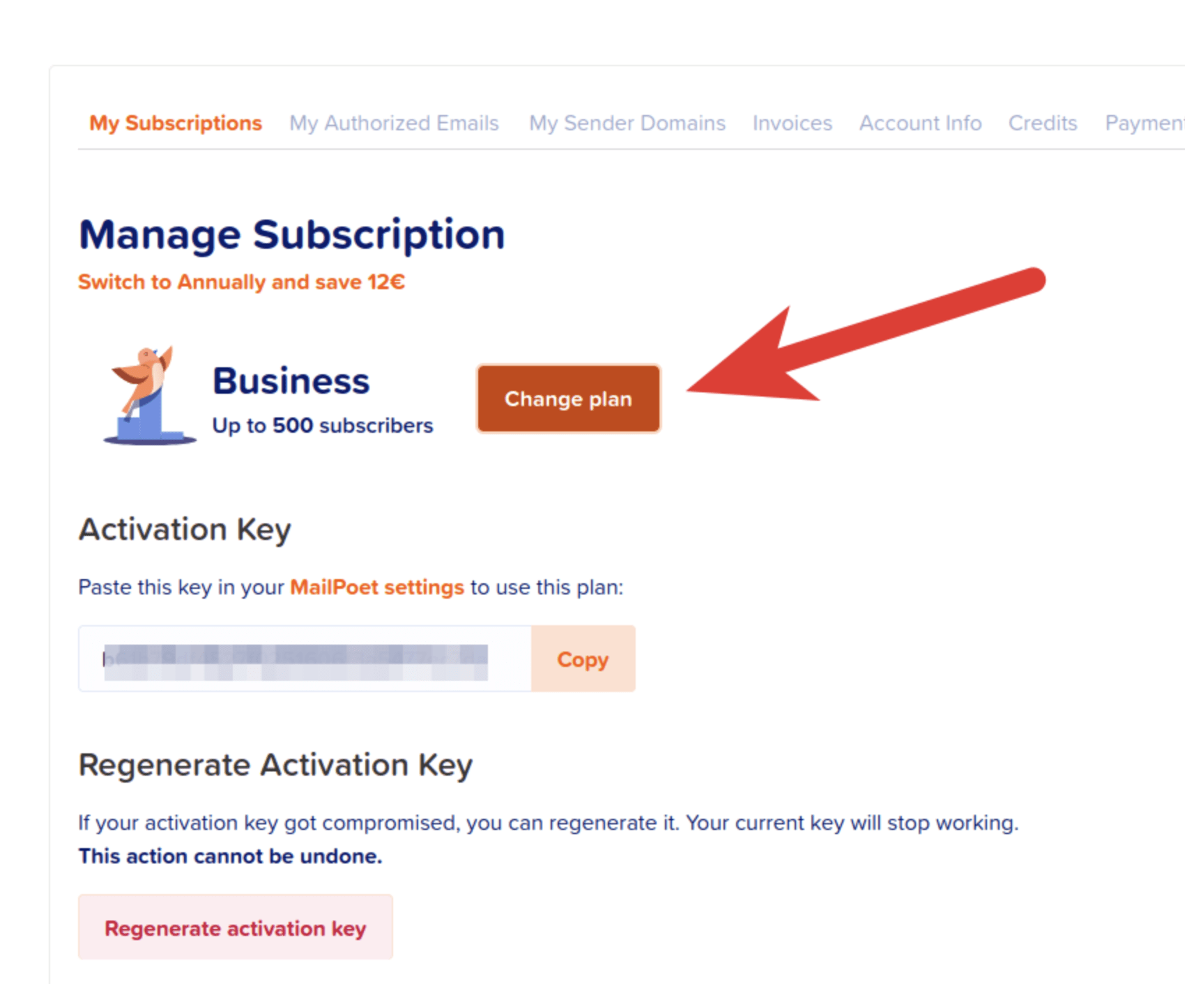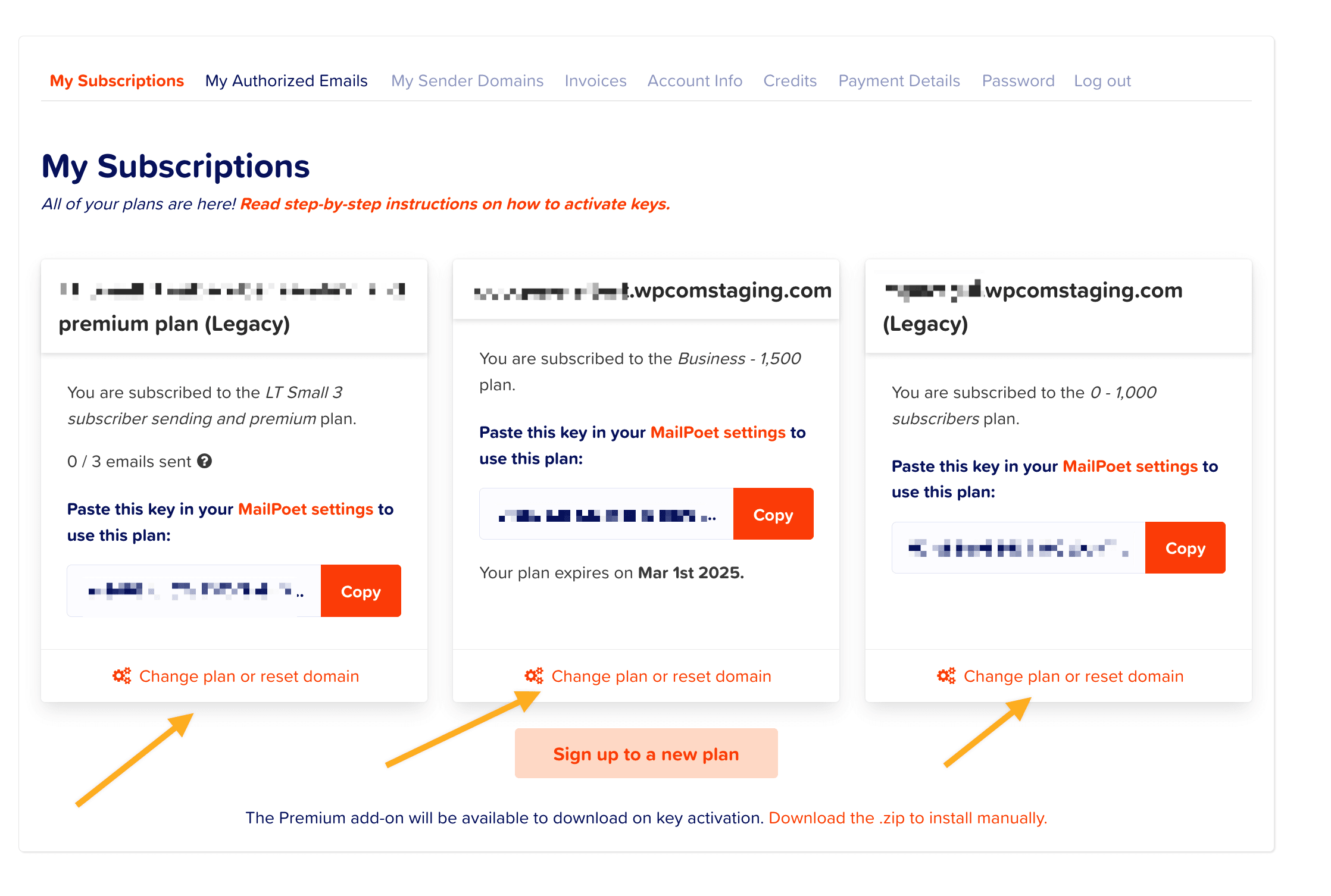 1. From the Manage Subscriptions page in your MailPoet account, click Change Plan or Reset Domain: