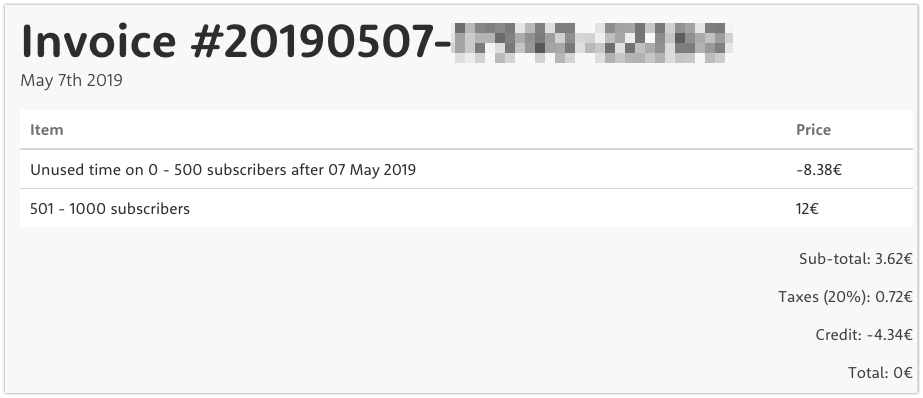 Upgrading a subscription often results in a proration, which means a charge adjustment. We calculate the difference between the two plans based on the time the subscription upgrade was done.