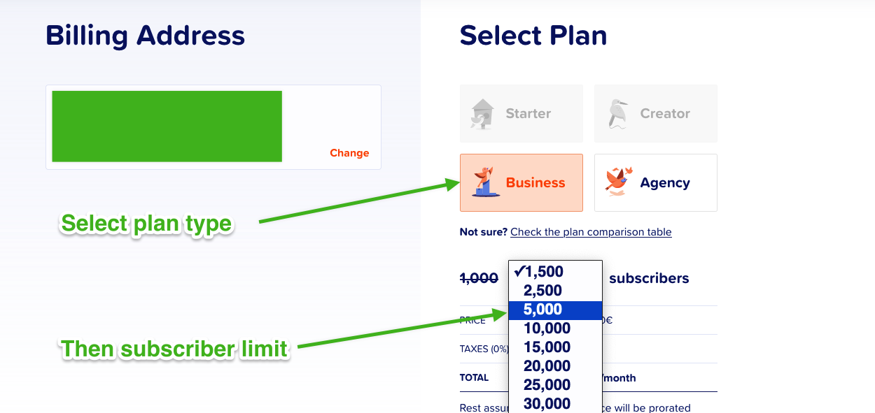 3. Once you’ve clicked on the “Change Plan” button, you’ll be redirected to the checkout page where you can select the plan type you’d like to upgrade to (if you want to switch plan types), select the subscriber limit you need for your site(s), and confirm the price.