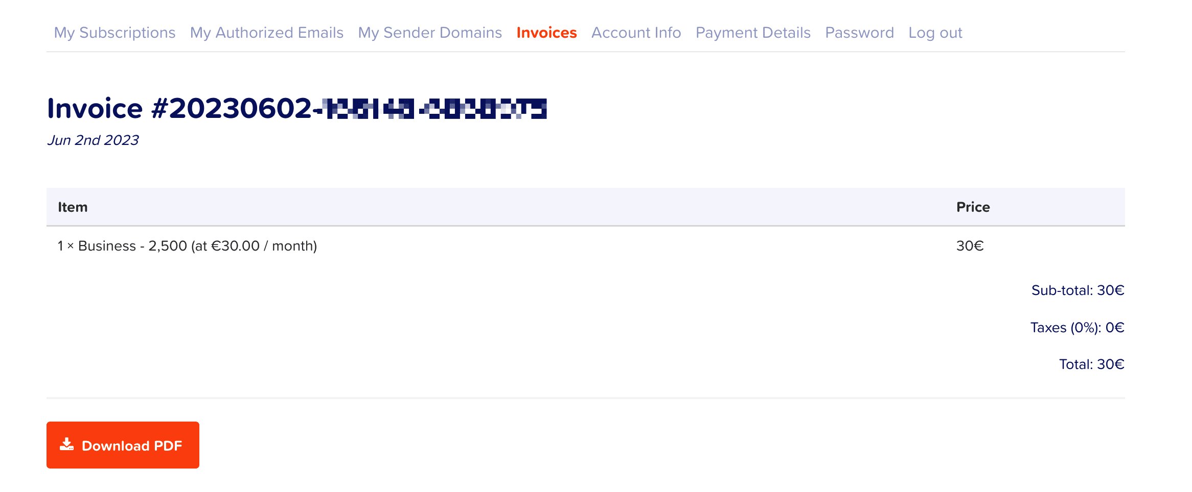 Here, you can view and download the invoices for your purchases. Click the date to access the invoice details and to download it as a PDF.