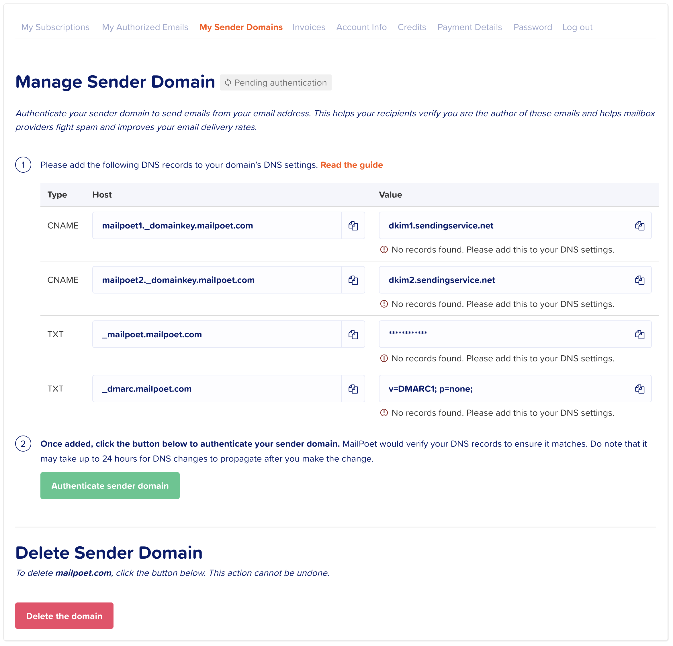 This section is where you can authorize your sender domain(s) or manage the ones you’ve already authorized.