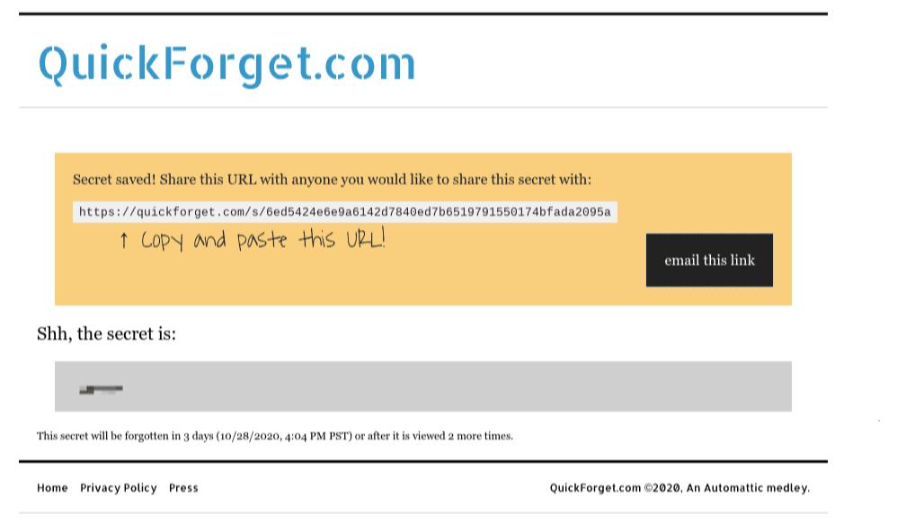 2) For security purposes, use our QuickForget tool and paste your site login URL and password into “The secret is…” field. Select “Save my secret” to get a URL you can then share with us. Please do not send the password to us directly.