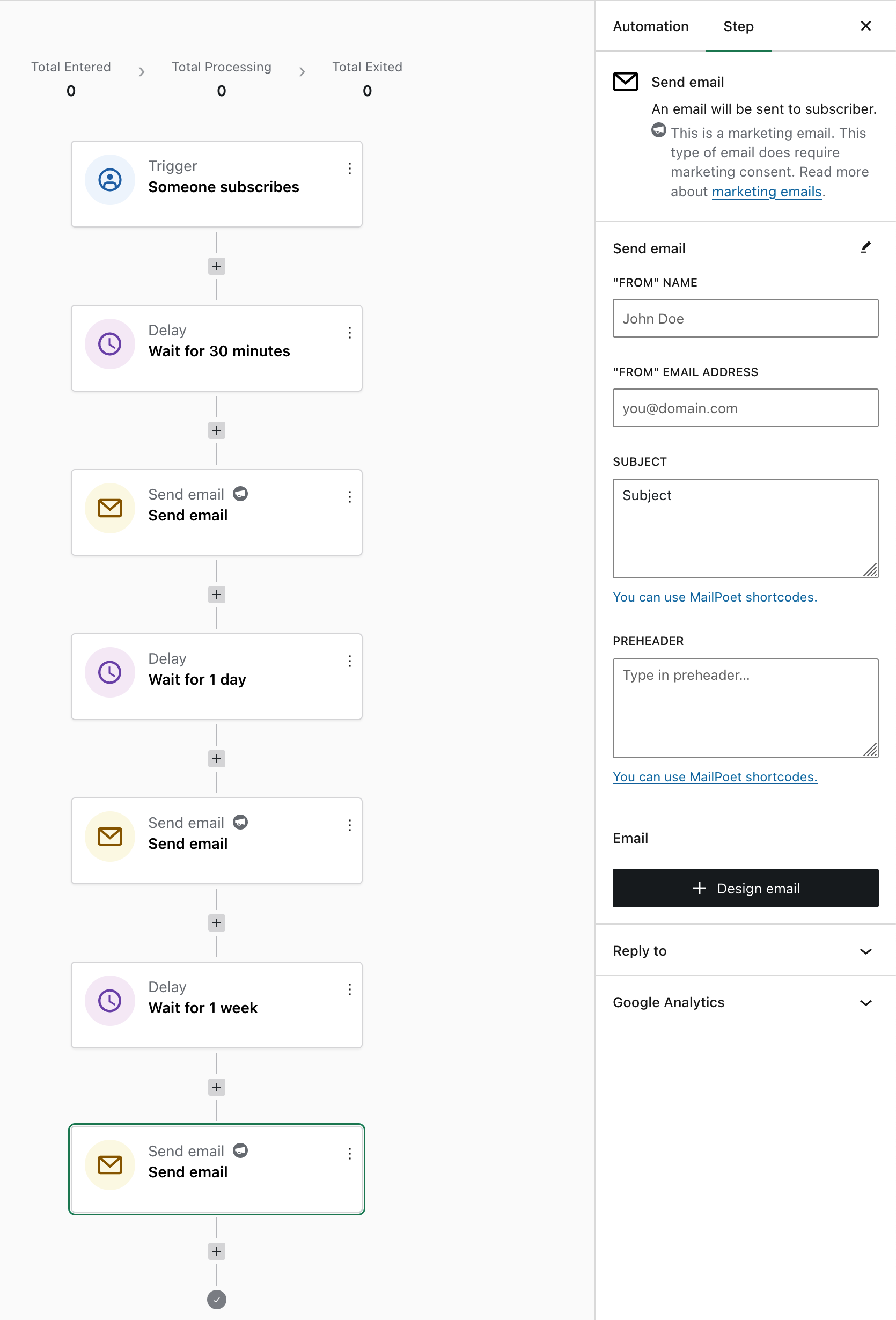 If you click the Send Email actions, you will see the settings on the right sidebar where you can quickly edit a few aspects of the email, such as the subject, preheader, “from” address, and you can also click Design email to open the email editor and create your email content. You can also create an email from a template, just like you do via MailPoet > Emails menu. You can learn how to use our email editor here.