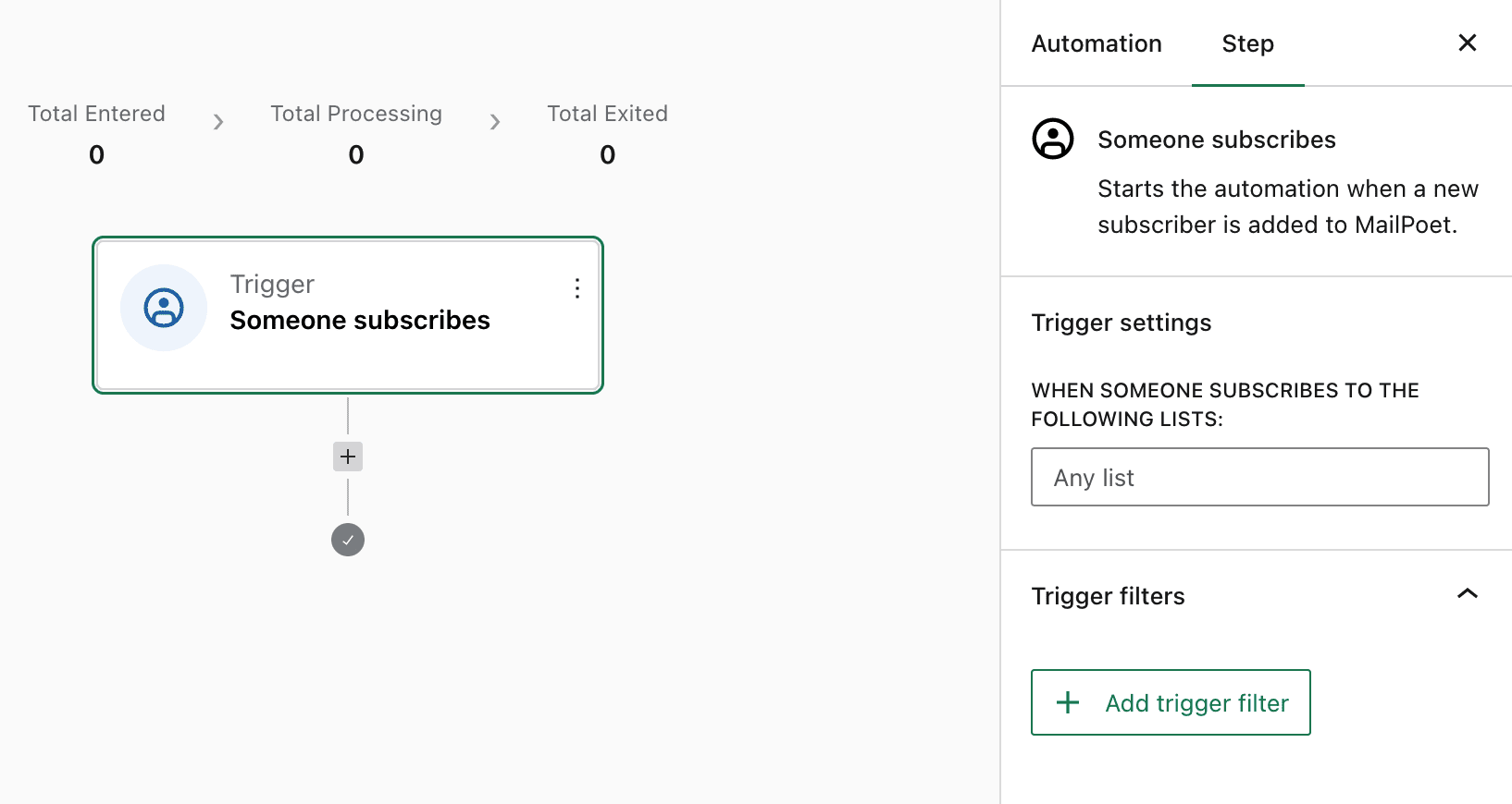 Now you should be seeing the Edit Automation page where the first step is to add a trigger. In this example, we’ll use the Someone Subscribes trigger: