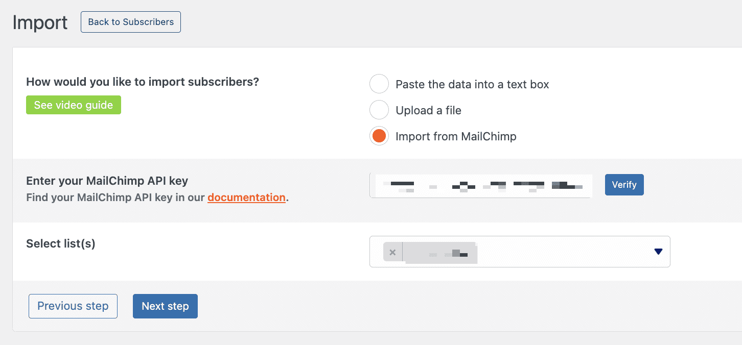 There are two methods of importing from MailChimp. You can either export the subscribers from your MailChimp account and import the CSV file or you can import directly from MailChimp using an API key. Both methods are covered below.