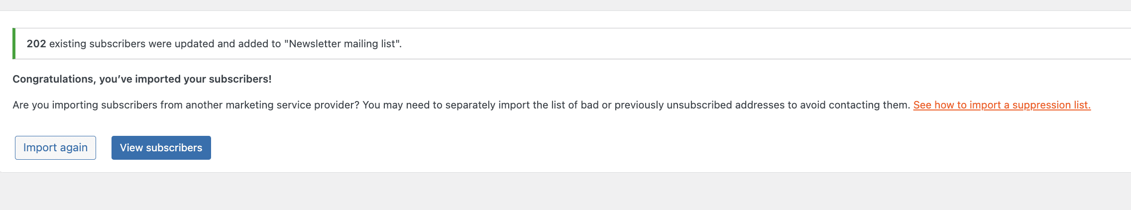 Go to your WordPress dashboard > MailPoet > Subscribers > Import. Select “Upload a file” and select the subscribed CSV from the zip.