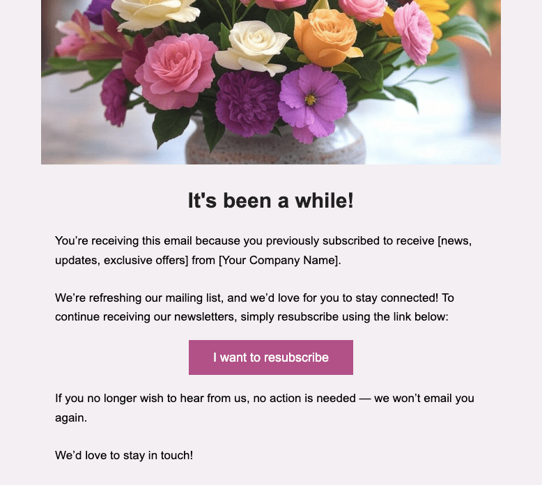 It’s been a while! You’re receiving this email because you previously subscribed to receive [news, updates, exclusive offers] from [Your Company Name].