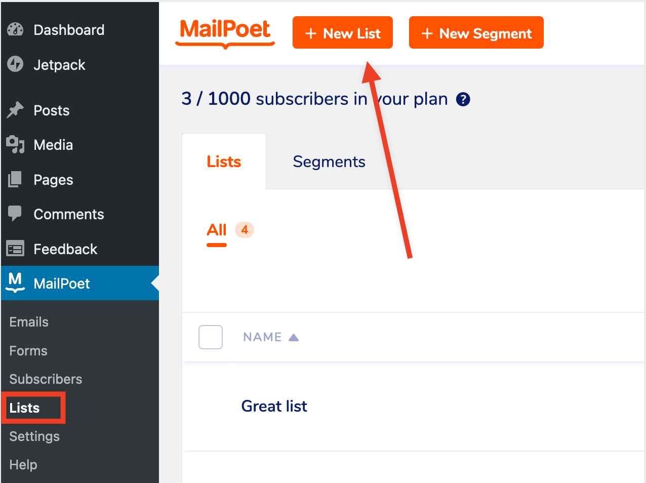 In your WordPress admin, go to MailPoet > Lists, and click on “Add New” to create a new list that will contain only the confirmed subscribers: