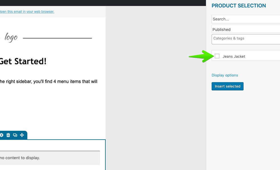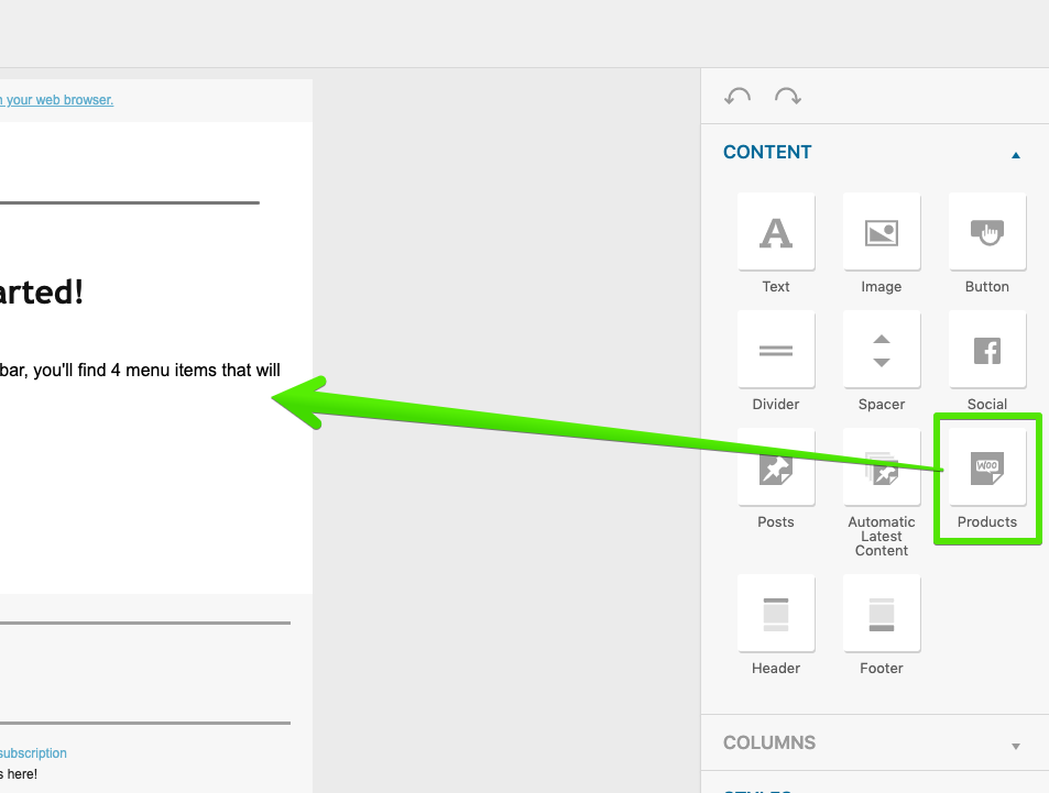 When you have the WooCommerce plugin installed, you can add the Products from your shop to your newsletter using the “Products” widget. Here’s how you can do it: