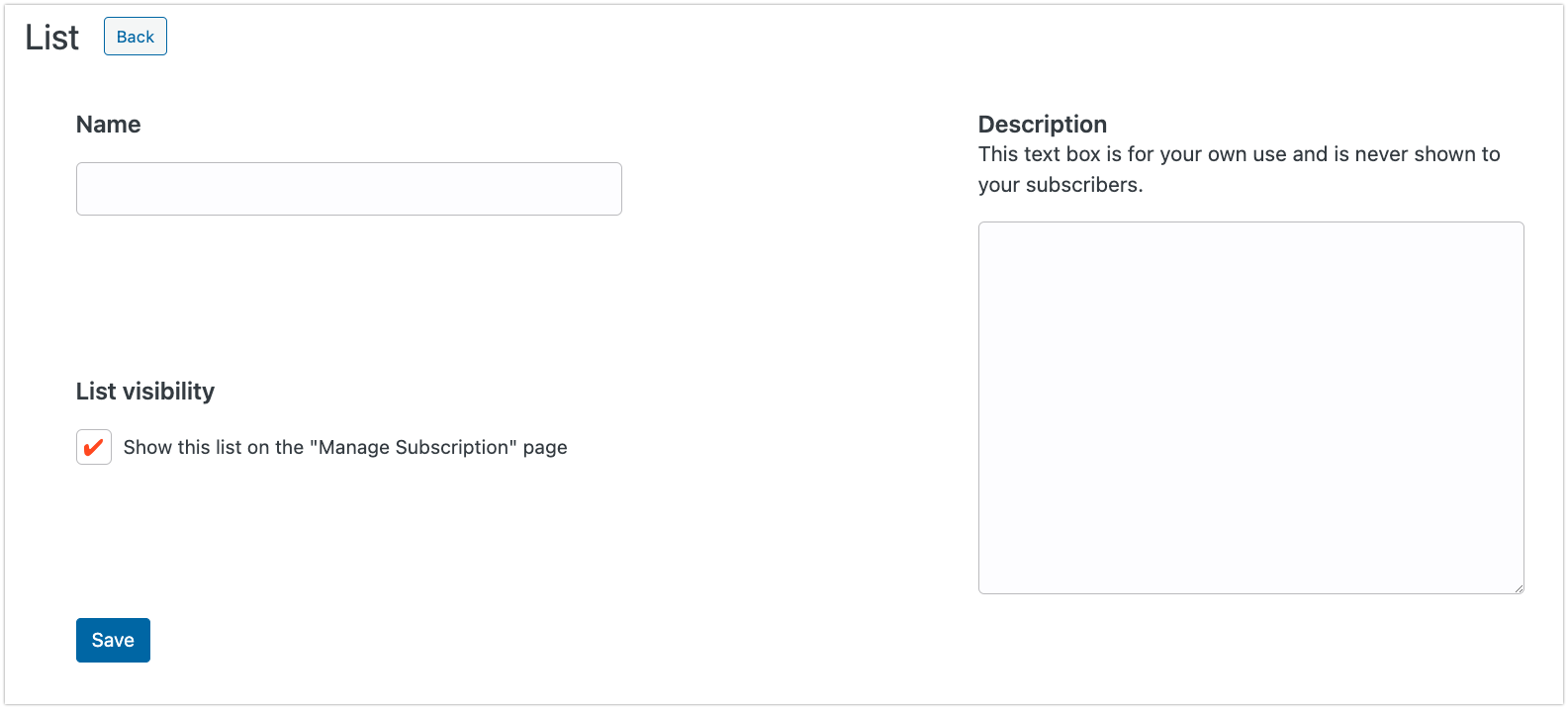You can also check a checkbox if you want this list to be shown on the Manage Subscription page, so your subscribers can manage their subscriptions there.