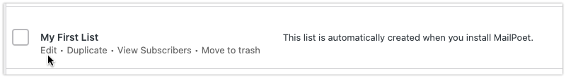 If you mouse over the list name, you’ll see the options: Edit, Duplicate, View Subscribers and Move to trash.