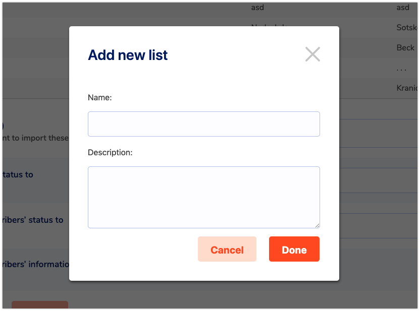 To create a new list, simply click on the ” + New List” button and type a Name and Description (optional) for it: