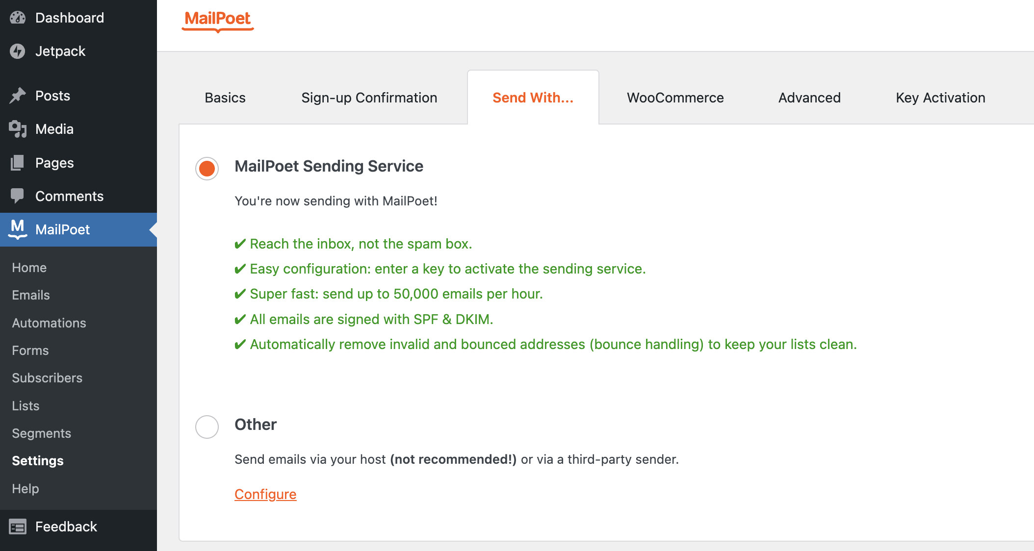 To set up your sending method, you’ll need to go to MailPoet > Settings > Send With… tab.