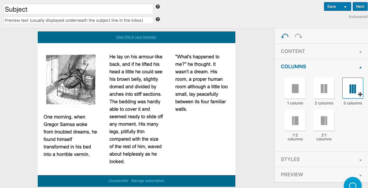 When designing a newsletter using the MailPoet Newsletter Editor, the first step should be adding your columns layout to start adding content into it.