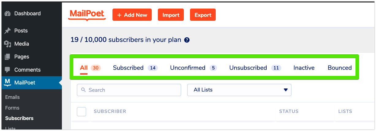 By going to MailPoet > Subscribers page, you’ll be able to see the list of all subscribers you have in the MailPoet plugin.