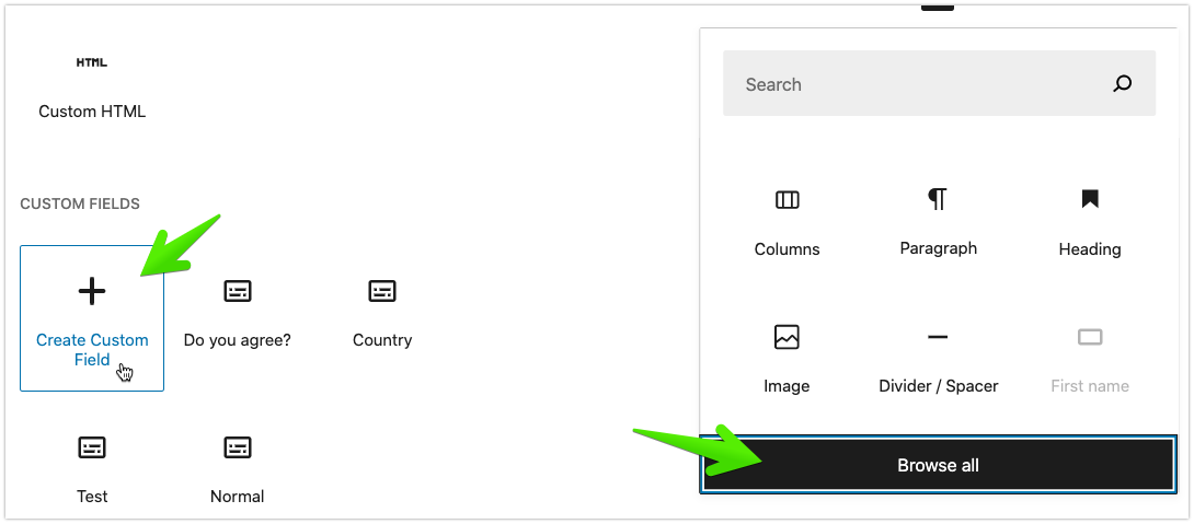 To create a custom field, you should click on the “+” icon to add a block > Browse all > scroll down to the “Custom fields” section and click on the “Create custom field” option: