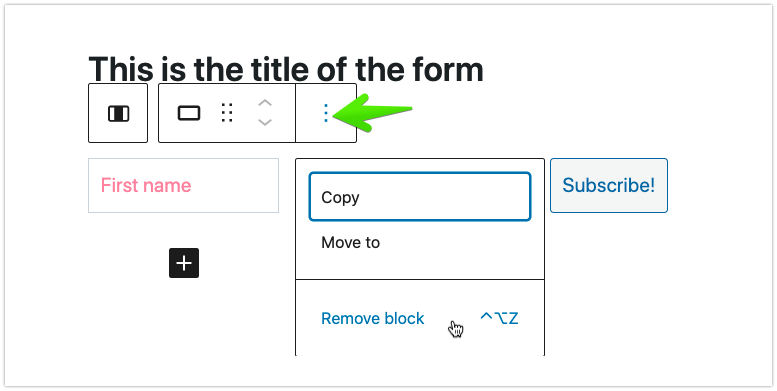 To remove it from the form, simply select the block and click on the 3 dots icon.