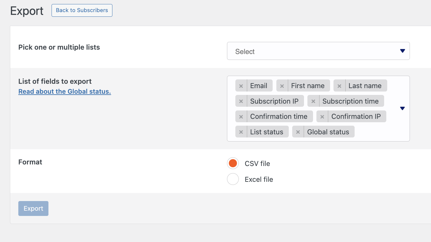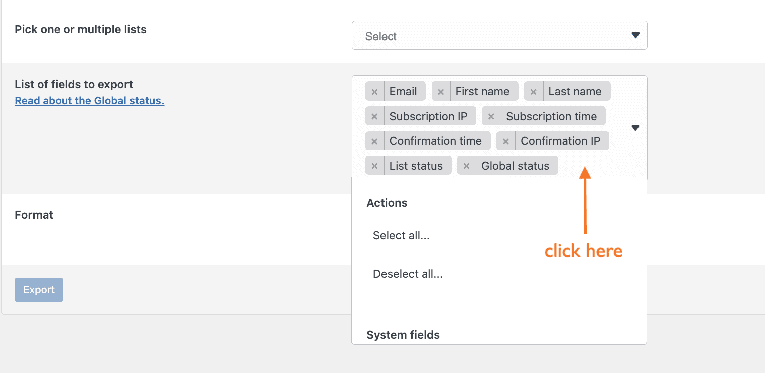 There you can select or deselect all the fields, choose to export also the subscriber’s IP, and also select custom fields.