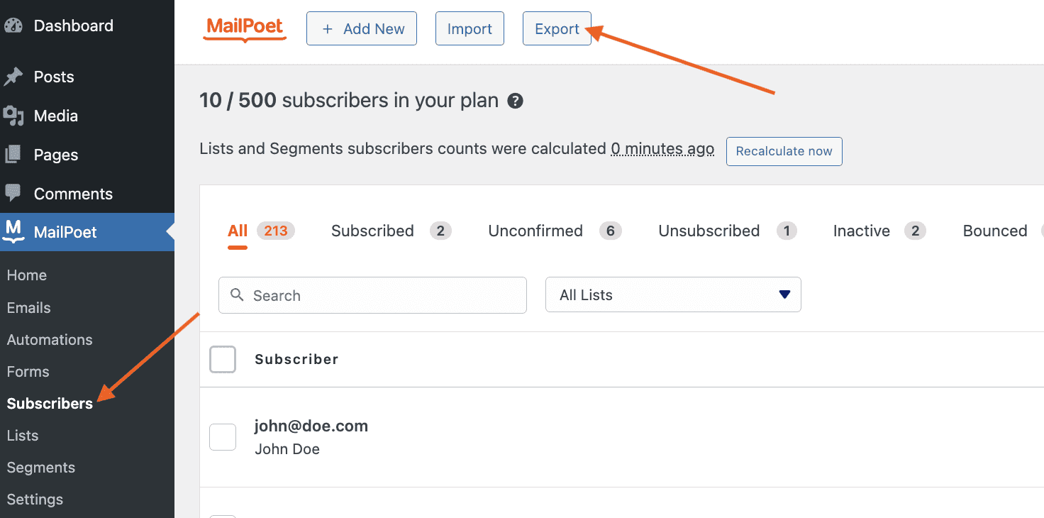 You can export your subscribers’ lists and/or segments by going to the MailPoet > Subscribers page and click on the “Export” button: