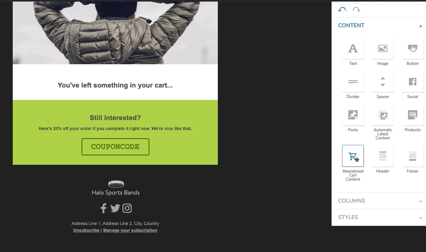 When you’re creating an Abandoned Cart WooCommerce automated email, you’ll see the option to add an Abandoned Cart Content widget. It will display the actual shopping cart content in an Abandonded Cart email.
