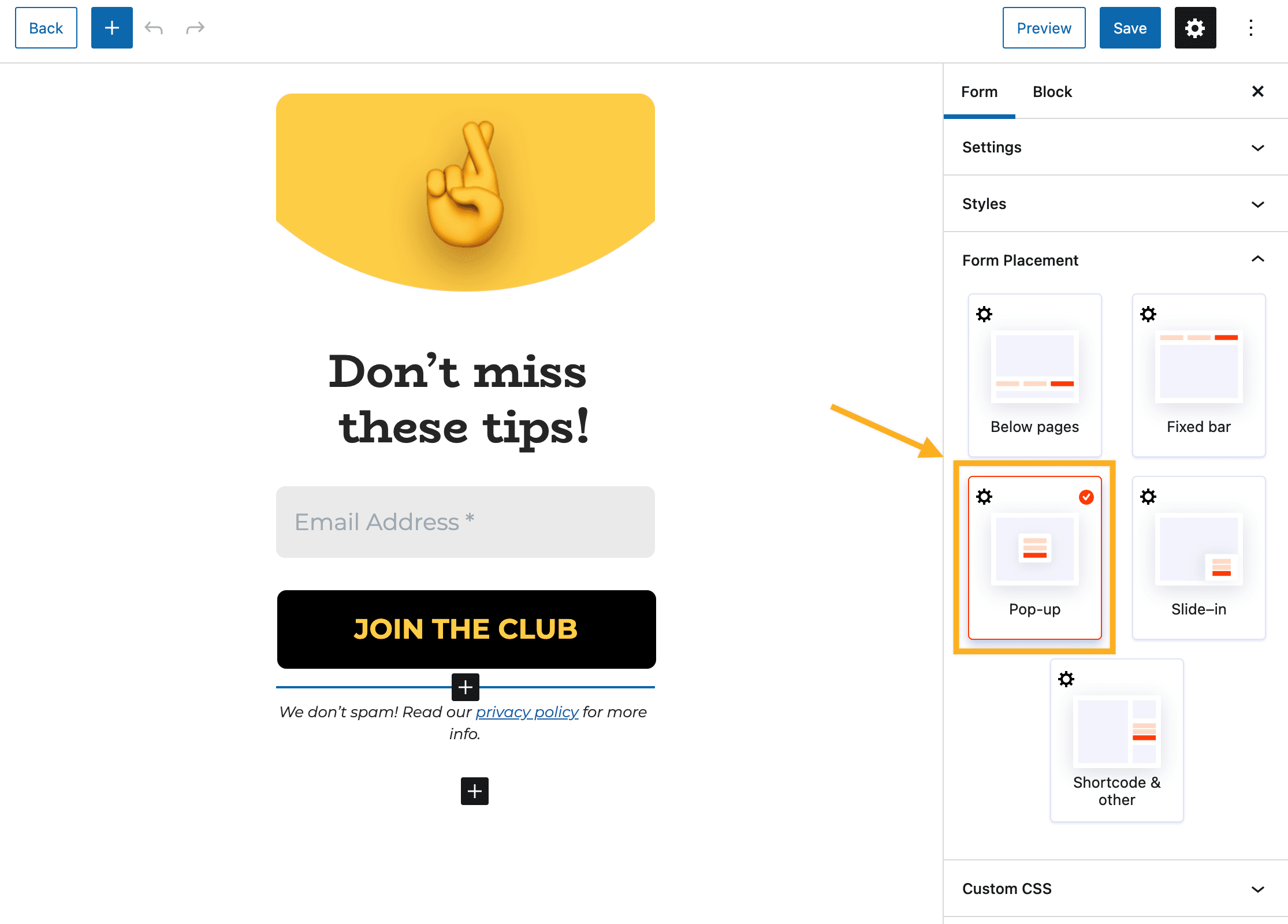 1. Choose the Pop-up block under Form Placement menu on your right pane: