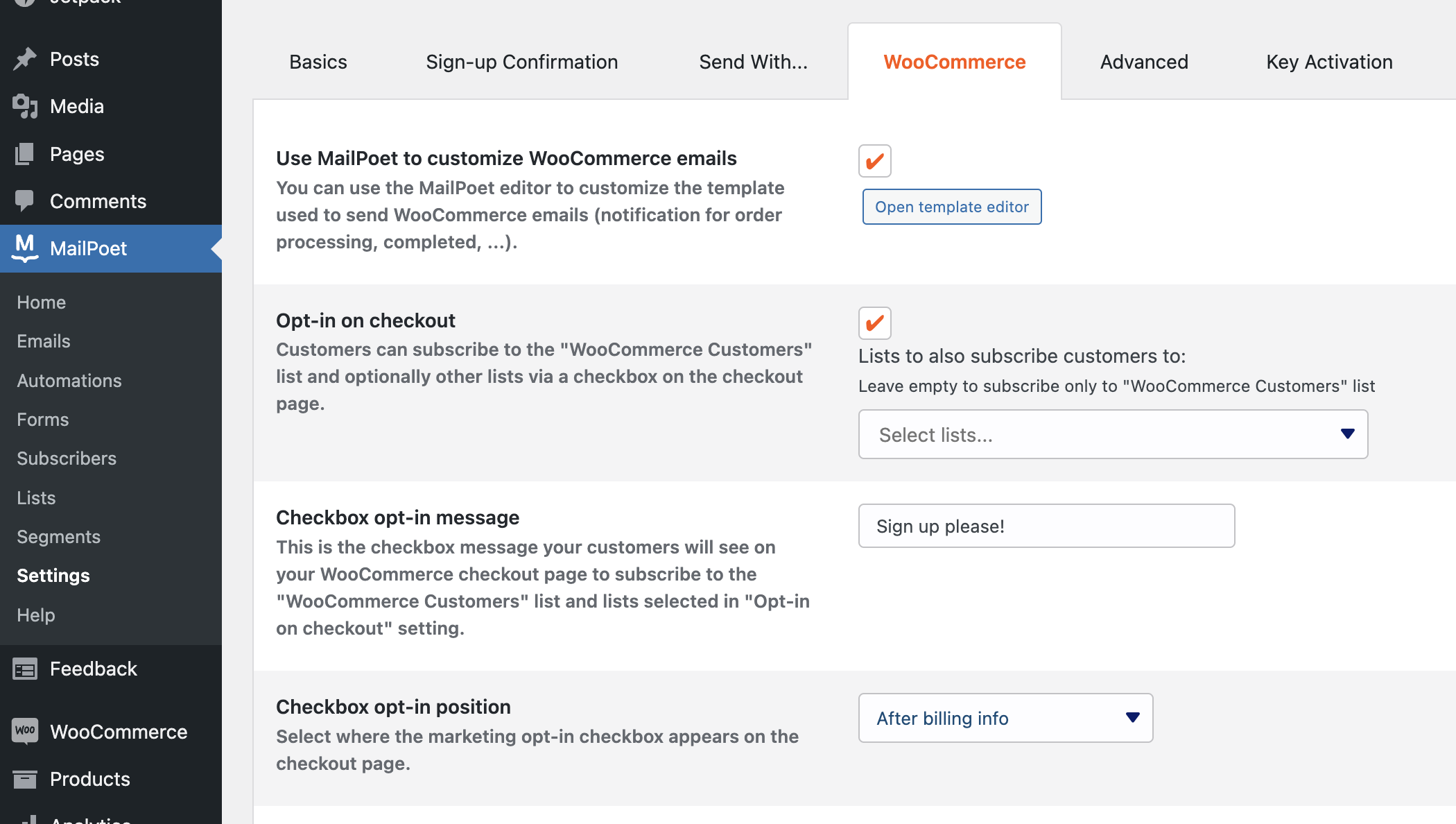 If you have the WooCommerce plugin installed, you can add an opt-in checkbox from MailPoet to your checkout page so your customers can subscribe to your mailing list and receive emails sent from the MailPoet plugin.