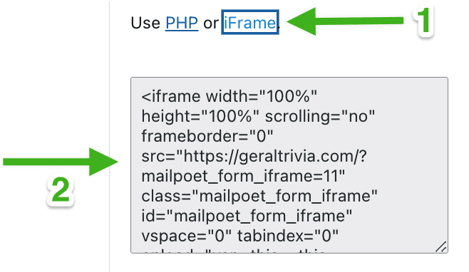 - Copy this iFrame code, ensuring it includes the complete script provided by MailPoet.